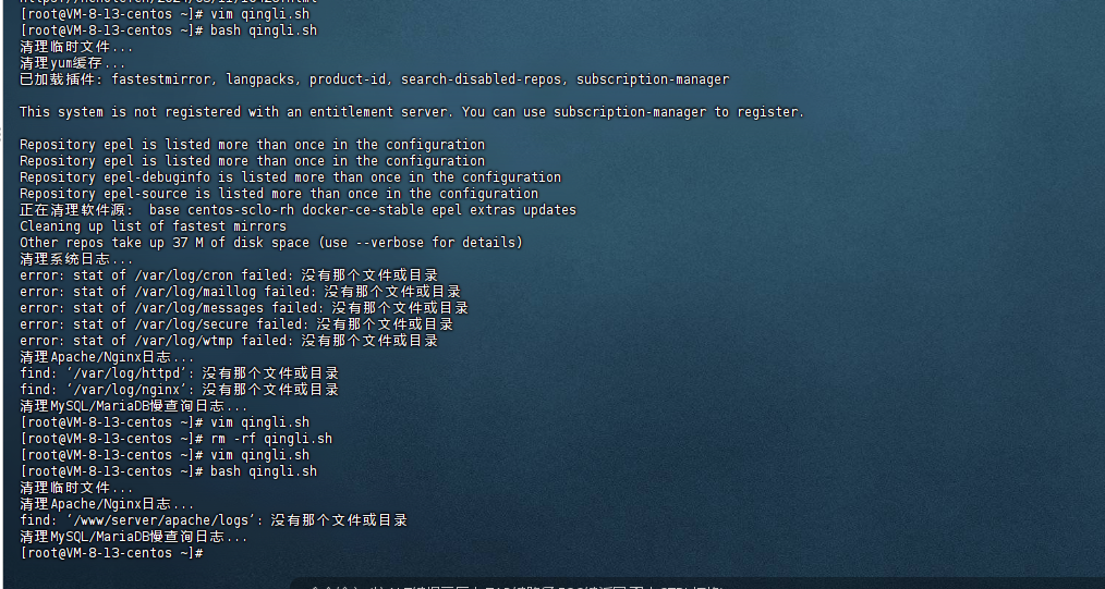 这个脚本使用方法,首先你先创建一个文件比如vim qingli.sh使用这个命令创建一个这样的文件,然后把脚本复制粘贴到里面,之后输入bash qingli.sh执行一下这个脚本,然后可以运行了,我的这个路径写的和大家的有可能不一样,如果你使用的是宝塔的话,我建议查一下宝塔的相关路径,比如宝塔的日志路径,然后你再把这个脚本上面的路径给他改一下。